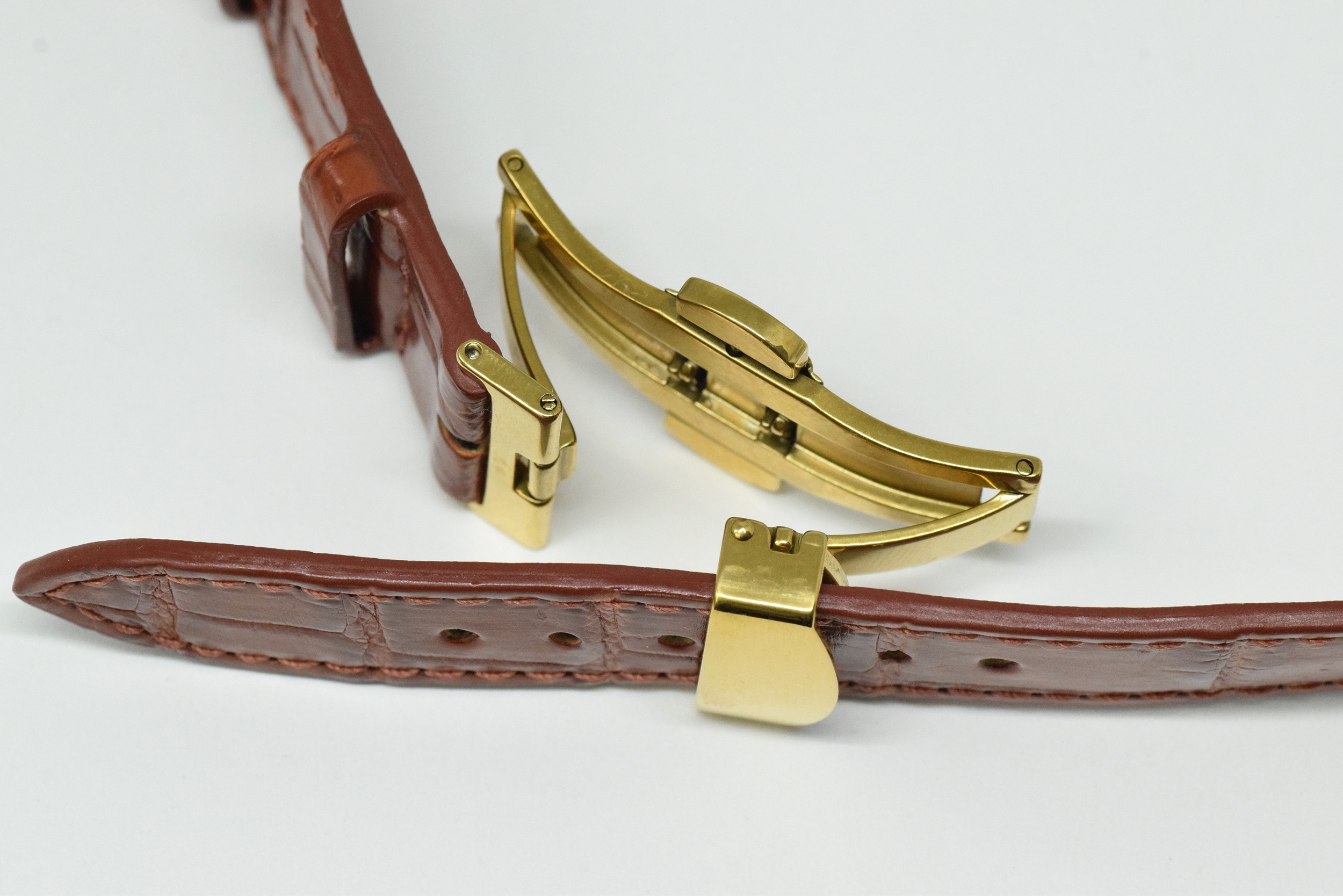 また、一般的なピンバックルのタイプより折り畳み式のフォールディングバックル(ディプロイメントバックル)を使用するほうが革への負担を減らせます。ピンバックルだと毎回革部分の穴に抜き差しする事になりますが、フォールディングバックルは都度抜き差しの必要がないためです。